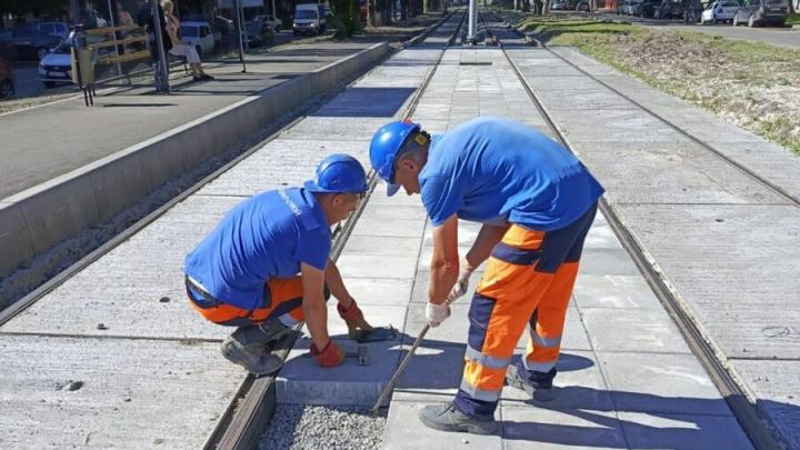 Круглосуточная работа на скоростном трамвае: уложено более 2,3 тысячи крупных плит и 7,5 мелких