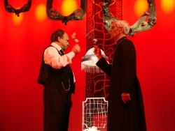 Лауреат Нобелевской премии Метерлинк, известный в современной России преимущественно как автор рождественской феерии «Синяя птица», являлся для символистов серебряного века, для таких неординарных натур, как Блок и Брюсов значимой и интригующей их воображение фигурой. Творчеством увлекались талантливейшие поэты, его пьесы ставили крупнейшие российские режиссёры. Интересно, что убеждённый атеист Метерлинк (согласно собственной воле, он даже похоронен при полном игнорировании соответствующих церковно-погребальных ритуалов!) создавал произведения, пронизанные духом божественного. Как тут не вспомнить замечание кого-то из острословов: если вы атеист, значит, Богу угодно наблюдать вас таковым. От себя добавлю: побольше бы таких атеистов и жизнь наша из чертовски сложной глядишь, получила шанс приблизиться к божественно гармоничной! Правда, божественность Метерлинка далека от церковных канонов, и скорее повенчана с атмосферой сказки, являющейся из заповедных уголков человеческой души и неказистости повседневного быта. Как и подобает классикам, Метерлинк современен. Во всяком случае, во время просмотра "Чуда…" чувство узнавания и изумления: "так ведь это про нас!" охватывало собравшихся в зале с такой силой, что во время антракта схожими эмоциями делились друг с другом незнакомые люди. Но прелесть и магнетическая привлекательность "Чуда святого Антония" не только в современности. В пьесе угадано и схвачено то, что существует и торжествует и над временем, и над национальностью, и над общественным строем. Это пьеса об ангелах и бесах наших душ, об искушениях, оказывающихся непреодолимыми и о том, что апостолы и ангелы из века в век приходят в мир людей в рубище и выглядят - в большинстве своём - довольно непритязательно, в то время, как главный враг ДОБРА и ПРАВДЫ, главный оппонент господа Бога неизменно прельстителен и появляется преимущественно под фанфары и аплодисменты толпы, которая - хоть стреляйся! - никак не дорастёт до звания народа. Впрочем, в "Чуде святого Антония" дьявол, пришедший арестовать святого, и вовсе олицетворяет букву попранного им же закона. Пристав ( последняя роль скончавшегося в этом году старейшего актёра драмы Владимира Мишанина) благообразен и степенен. Затянутый в чёрный, кожаный плащ, эту униформу гангстеров всех мастей, времён и народов, он - власть, воплоти, к которой (по стойкому убеждению многих обывателей!)- не может быть претензий уже, потому что она власть. Ей, власти, с точки зрения обывателей всегда виднее кого арестовывать и забирать! Раз люди в форме пришли за этим полоумным Антонием - значит, он и впрямь полоумный. А для того, чтобы ставить слова представителя власти под сомнение надо научиться самостоятельно мыслить, а это подавляющему числу ох, какой недосуг. Состояние сытой, ленивой, тягучей, как жвачка безответственности, безответственности не то что за других, но даже и за себя демонстрируют члены семьи, с которыми и происходят все необыкновенные события пьесы. А где паутина равнодушие там он, дьявол особенно успешно расставляет сети. К тому же равнодушие усиливается ноткой не то страха, не то плебейства, ведь явлению духа зла предшествуют его верные шестёрки. Его не обременённые интеллектуальной деятельностью солдафоны -сержант (Андрей Казаков) и рядовой полиции (Игорь Игнатов). Тупос