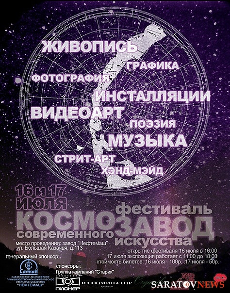 Очередной "Завод" будет проведен 16 июля и 17 июля на территории завода "Нефтемаш" по адресу Большая Казачья, д. 113 (вход с Казачьей почти напротив университетских корпусов). На этот раз сквозной темой события станет "Космос", что, с одной стороны напоминает о юбилее первого полета, с другой стороны, трактуется очень широко. Хотя, будем честными, тема не слишком важна. Для меня каждый раз "Завод" становился поводом увидеть много красивых, радостных и свободных людей в одном месте. Даже не очень важно, что там будет. Будут, концерты, перформансы, театральные выступления. Будет выставка, которая продлится и на следующий день.
