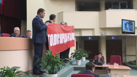 На думском заседании коммунисты удвоили усилия – принесли в зал заседаний два мегафона, один из них включили на режим сирены, во второй вещал лидер думских коммунистов Александр Анидалов. Впрочем, понять, что говорил Александр Юрьевич, было невозможно из-за шумовой завесы.