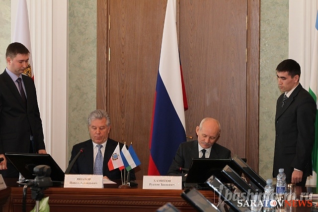 Сегодня президент Башкортостана Рустэм Хамитов и губернатор Саратовской области Павел Ипатов подписали протокол о реализации в 2011-2012 годах договора о дружбе и согласии между двумя регионами. Договор, действующий с 2003 года, продлевается каждые пять лет, а каждые два года наполняется новым содержанием.