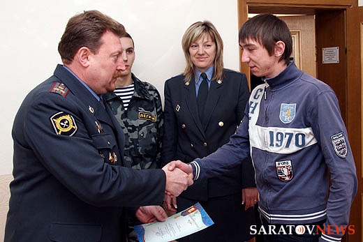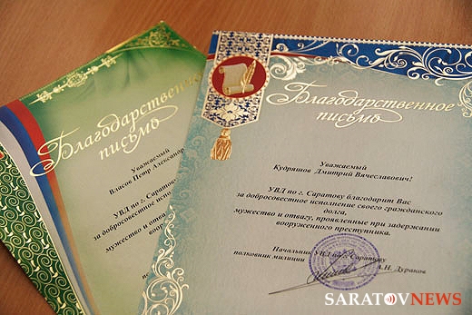 Сегодня в торжественной обстановке начальник ОМ №6 в составе УВД по Саратову Николай Сорокин поблагодарил двух 22-летних юношей за проявленную гражданскую позицию и личное мужество. Петр Власов и Дмитрий Кудряшов получили благодарственные письма за задержание грабителей, случайно оказавшись рядом с местом преступления.