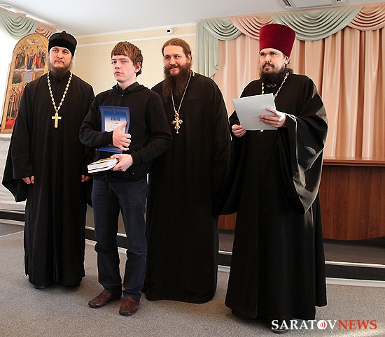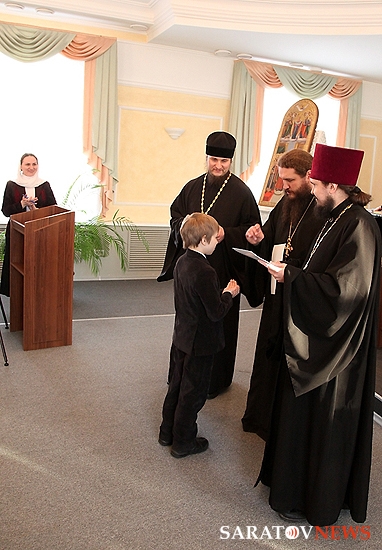 Руководитель Отдела религиозного образования и катехизации Саратовской епархии священник Сергий Штурбабин поздравил победителей, отметив, что конкурс показал высокий уровень участников. Грамоты и книги победителям вручили члены жюри конкурса - секретарь Епархиального управления, ключарь храма в честь Покрова Божией Матери Саратова игумен Евфимий (Митрюков) и настоятель Свято-Троицкого храма Саратова игумен Пахомий (Брусков).