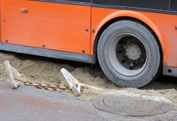 В настоящий момент на место прибыл грузовик с надписью "Техпомощь", видимо, для буксировки из дорожной ловушки.
