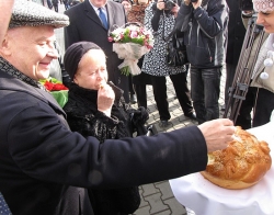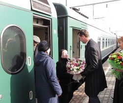 Встречать именитых гостей приехал зампред правительства области Алексей Данилов. Известных деятелей культуры встретили хлебом и солью, а также вручили букет цветов.