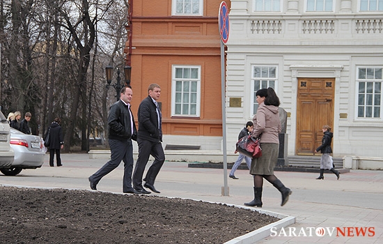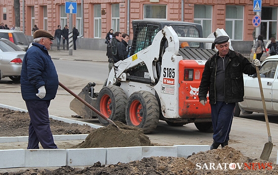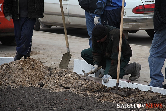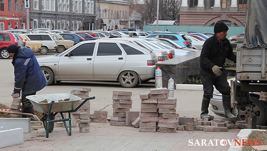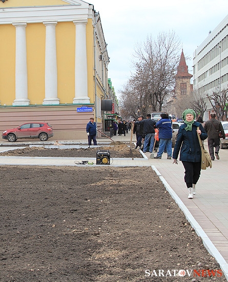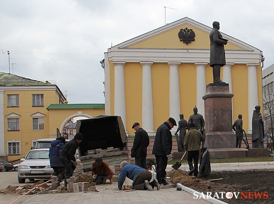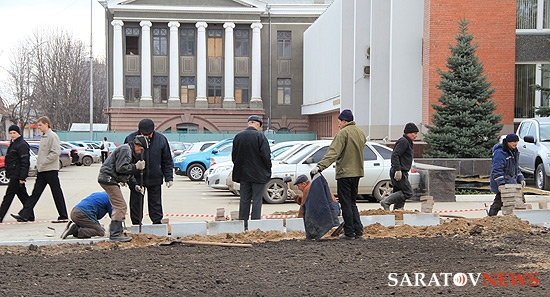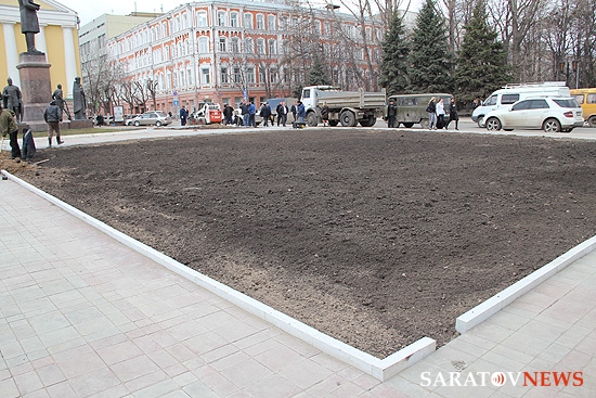 На площади Столыпина напротив здания Саратовской областной думы и администрации города отсутствует ранее установленное ограждение. Теперь на месте, где велись раскопки, выкладывается бордюр вокруг ровной поверхности земли.