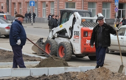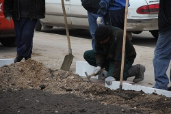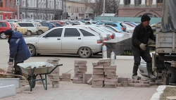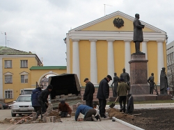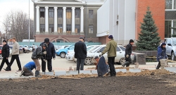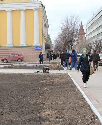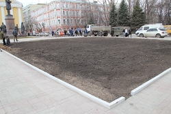 "Сейчас, чтобы на площади не парковался транспорт и автовладельцы не мешали работать специалистам нашего предприятия, мы огородили часть площади забором, убрали часть тротуарной плитки. Затем мы срежем старый грунт, завезем и уложим слои плодородной почвы, при наступлении тепла - "застелим" цветники рулонами газонной травы и высадим красивые цветы. После этого ограждения будут убраны, а обрамлять цветники будет специальный бордюрный камень", - пояснял директор МУП.