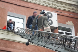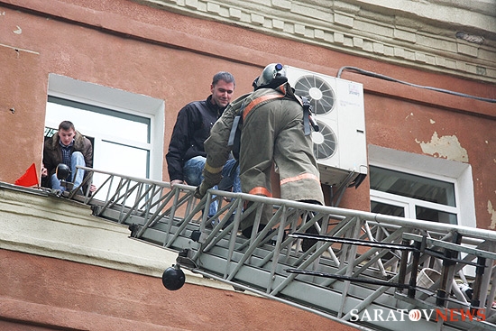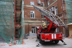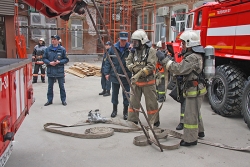 Согласно вводной, возгорание произошло на третьем этаже в одном из кабинетов. Проводилась эвакуация персонала.