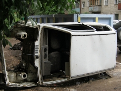 На белоснежной малолитражке отсутствовали номера, двигатель, фары и стекла. Были они сняты владельцами, или разобраны прямо на месте, неизвестно. Корпус, в том числе и двери, интерьер салона, и, частично, ходовая часть машины сохранились.