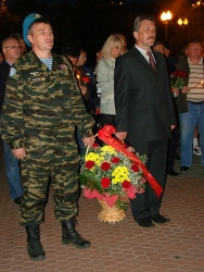 Собравшиеся почтили жертв Великой Отечественной войны минутой молчания. Несколько человек в этот момент даже встали на колени. После этой паузы наступил черед возложения цветов к вечному огню. Первым такую возможность предоставили ветерану Георгию Фролову. Затем двое мужчин, по всей видимости военнослужащие, возложили к монументу венок. Следом за ними цветы у вечного огня положили пришедшие на мероприятие политические деятели и только потом все остальные участники. Примечательно, что рядом с вечным огнем был установлен небольшой столик для церковных свечей.