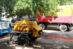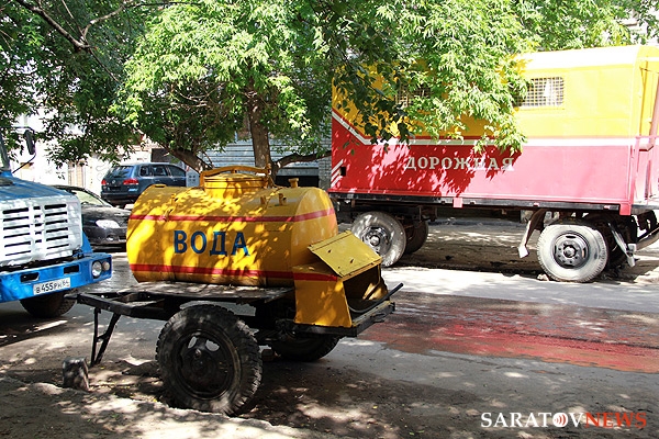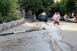Между тем, вода продолжает литься по улицам в сторону Волги. Возле места происшествия стоят дорожные машины, а также емкости с надписью "Вода".