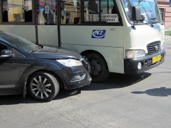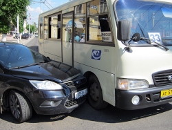 Автомобиль "Форд Фокус", ехав по Комсомольской, врезался в автобус, двигавшийся по 33-му маршруту в сторону железнодорожного вокзала по Московской. В результате столкновения сильнее всего пострадала иномарка.