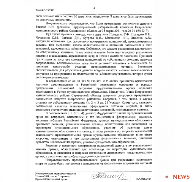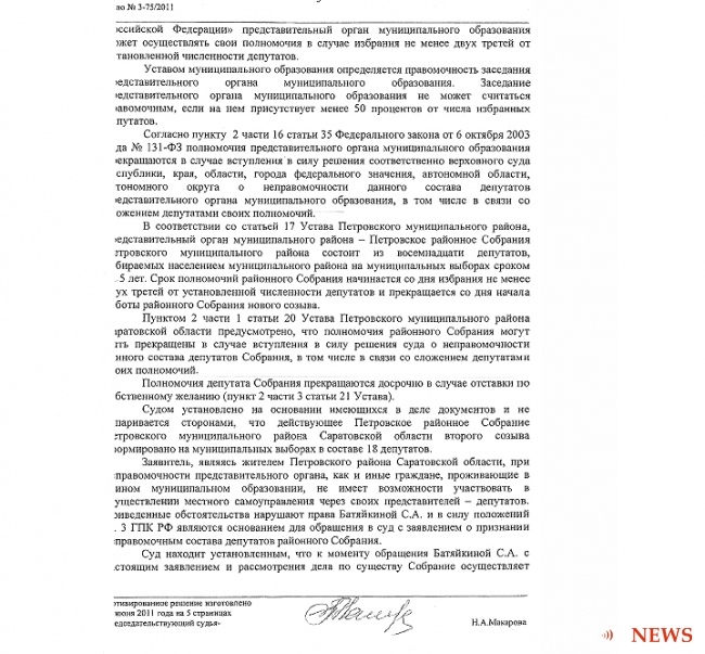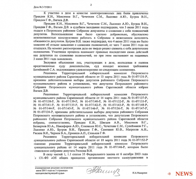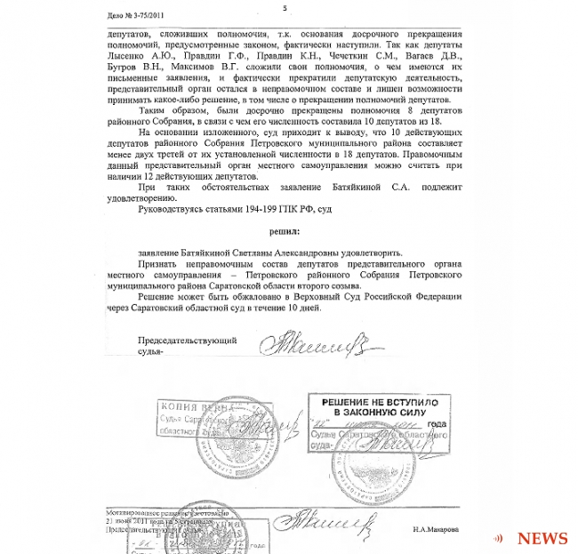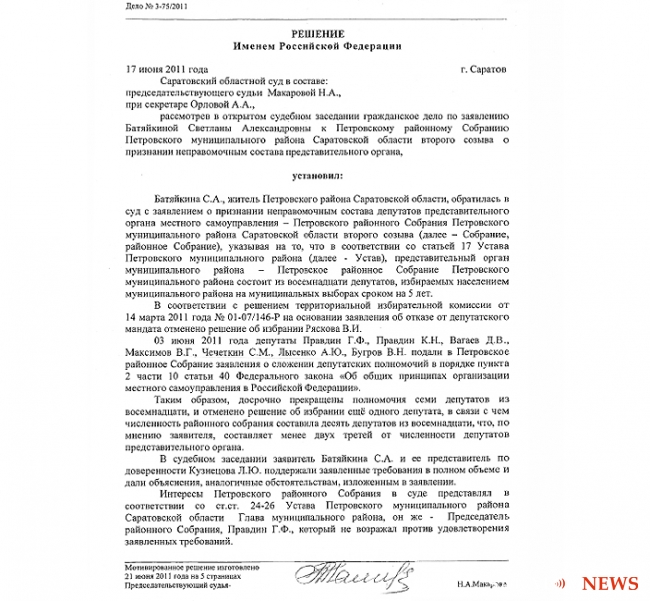 В решении суда сказано: "Заявление Батяйкиной Светланы Александровны удовлетворить. Признать неправомочным состав депутатов представительного органа местного самоуправления - Петровского районного Собрания Петровского муниципального района Саратовской области второго созыва. Решение может быть обжаловано в Верховный Суд Российской Федерации через Саратовский областной суд в течение 10 дней".