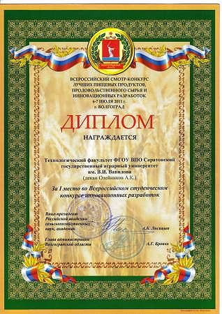 Студенты технологического факультета А.Власов, А.Горбатов, В.Гиро в Волгограде на международной научно-практической конференции "Инновационные технологии - основа модернизации отраслей производства и переработки сельскохозяйственной продукции" получили золотую медаль за разработку инновационного продукта "Органические сыровяленные колбаски "Сибирские"".