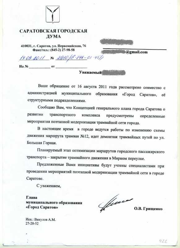 О строительстве новых трамвайных линий в рамках модернизации транспортной системы, а также конкретных дат Олег Васильевич в письме не указал.