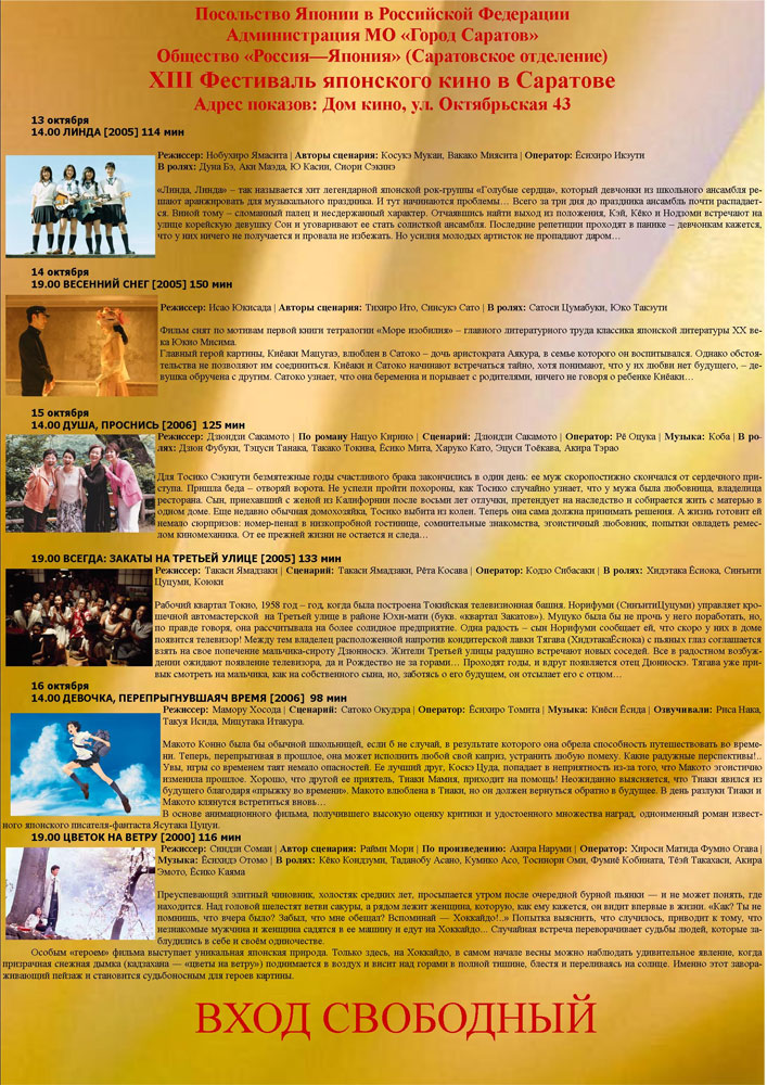 В Саратовском Доме кино состоится 13-й фестиваль японского кино. Мероприятие будет проводить посольство Японии при поддержке Саратовского отделения общества "Россия-Япония".
