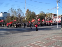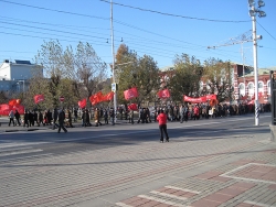 Только что сторонники КПРФ прошли колонной по Московской на Театральную площадь. Митинг коммунистов приурочен к годовщине Октябрьской революции. На растяжках митингующих содержатся предвыборные лозунги Коммунистической партии.