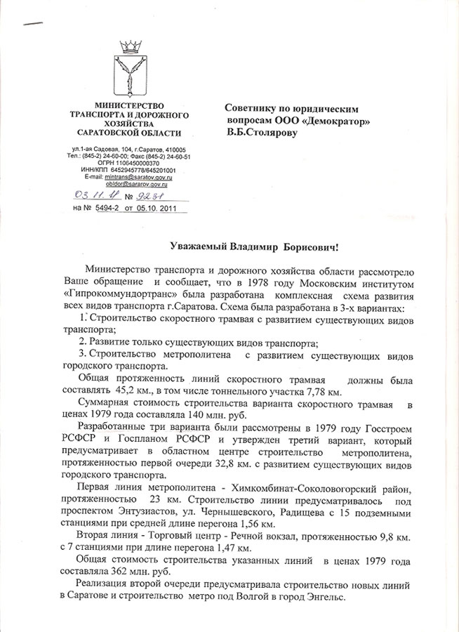 Министерство транспорта и дорожного хозяйства Саратовской области дало ответ на коллективное обращение граждан Саратова по поводу проводимых изменений в транспортной инфраструктуре города. Жители областного центра собирали подписи "против демонтажа трамвайной линии в Мирном переулке", а также за срочное начало работ "над перспективным планом реконструкции саратовского трамвая с превращением его в скоростной".