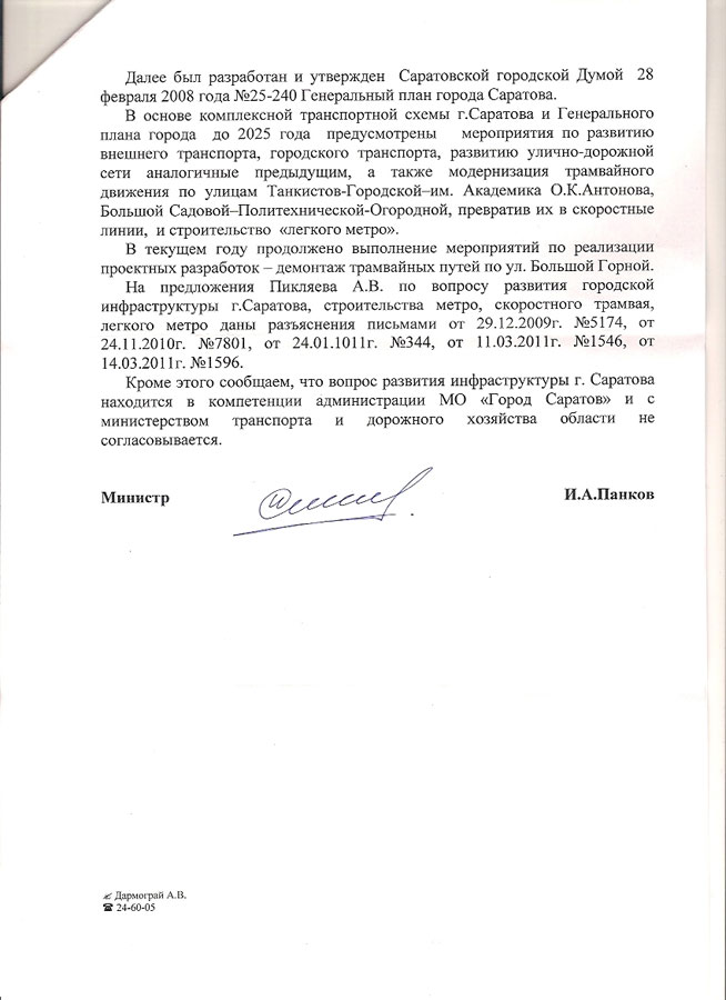Иван Панков сообщил также, что вопрос развития инфраструктуры вообще не в его компетенции, а администрации Саратова, и с его ведомством это не согласовывается.