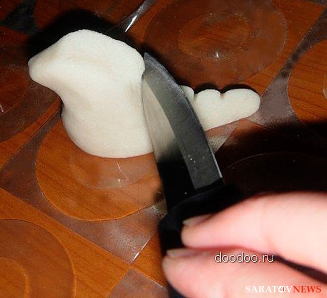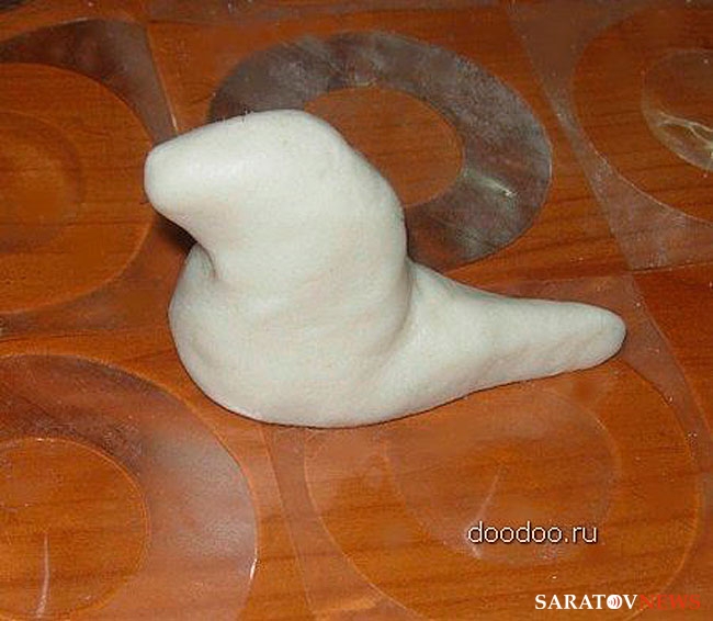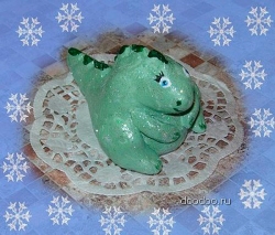 Из готового теста лепим фигурку, напоминающую длинную каплю. Загибаем и чуть-чуть вытягиваем широкий конец нашей капли вверх, делаем мордочку. На спине дракона вытягиваем гребень, а затем краешком ножа делаем на нем насечки. Далее лепим верхние и нижние лапы дракона, прикрепляем их к туловищу. Для того, чтобы детали крепче прикреплялись друг к другу, их нужно немного смочить водой на стыках.