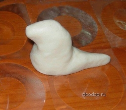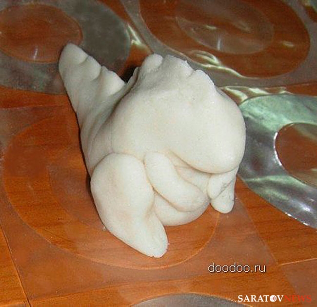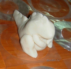 Для того, чтобы его вылепить, понадобится немного соленого теста. Тесто готовится так: 2 стакана муки, 1 стакан соли, около 125 мл воды. Желательно добавить в тесто немного крема рук. Поделку надо изготовить на той же доске, где она будет сохнуть.