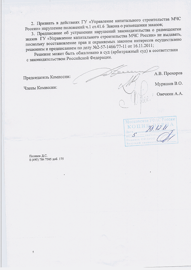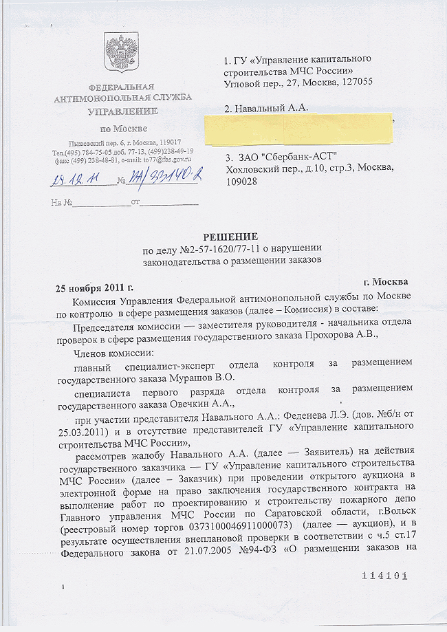 23 ноября 2011 года жалоба Навального была признана обоснованной. Размещение заказа было отменено на основании решения УФАС 4 декабря 2011 года.