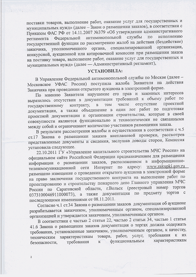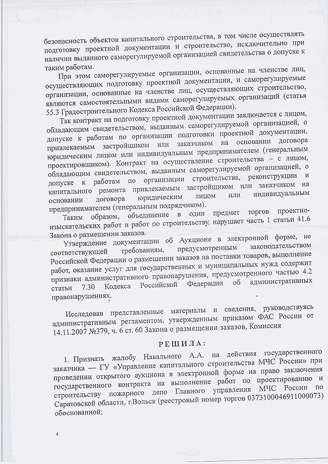 Госзаказ на строительстве в Вольске пожарного депо ГУ МЧС по Саратовской области был размещен на сайте госзакупок 22 октября 2011 года. Стоимость заказа была определена суммой 96 млн. рублей. Алексей Навальный подал жалобу в федеральную антимонопольную службу.