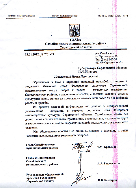 Глава Самойловского муниципального района Татьяна Кравцева обратилась к губернатору Саратовской области Павлу Ипатову с письмом в поддержку директора саратовского театра оперы и балета Ильи Кияненко. Обращение к губернатору подписал и глава администрации Самойловского района Алексей Решетников.
