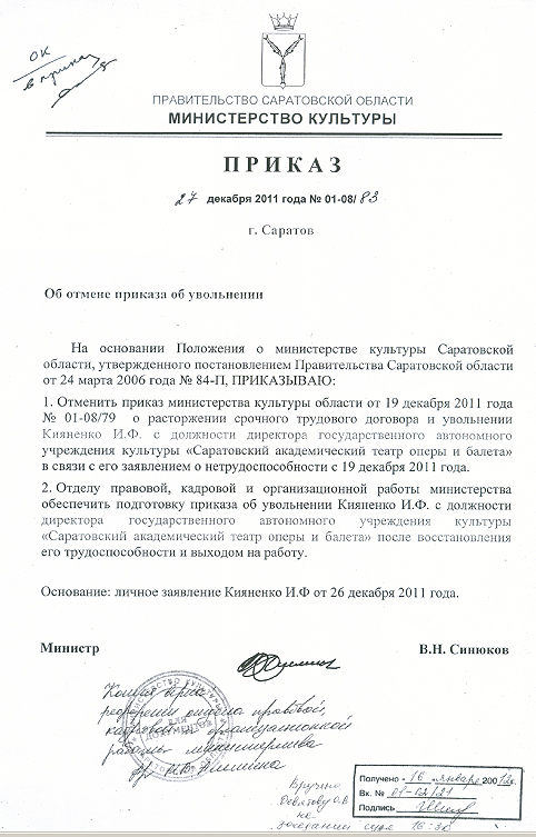 Между тем, министр культуры Саратовской области Владимир Синюков, инициатор отставки директора театра, не намерен прислушиваться к мнению театральной общественности. Уступив нормам трудового законодательства, Синюков отменил собственный приказ об увольнении Кияненко, в связи с тем, что руководитель учреждения находится на больничном, однако тут же поручил подготовить новый документ - об отставке после восстановления трудоспособности и выхода на работу.