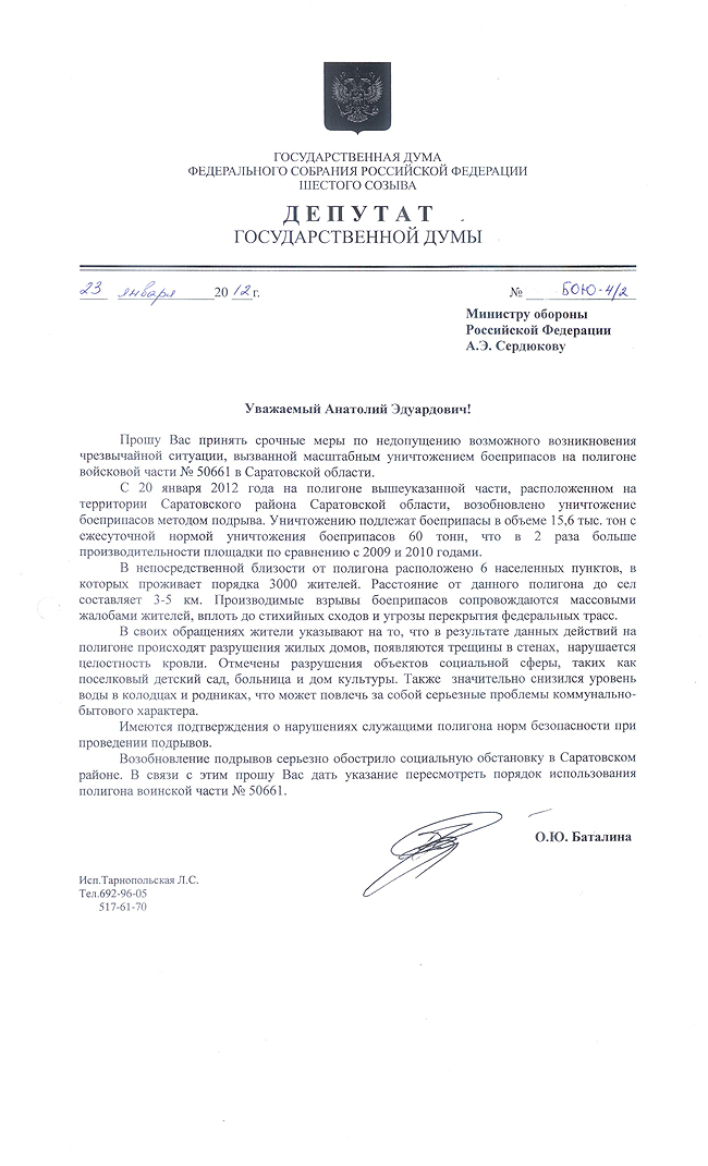 Депутат Государственной Думы РФ Ольга Баталина просит министра обороны Анатолия Сердюкова обратить внимание на утилизацию старых снарядов в Саратовском районе области. В СМИ распространена копия официального письма госдепа к главе Минобороны России.