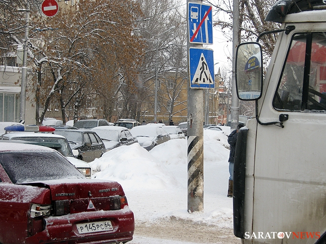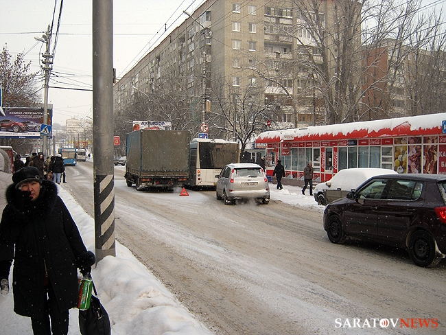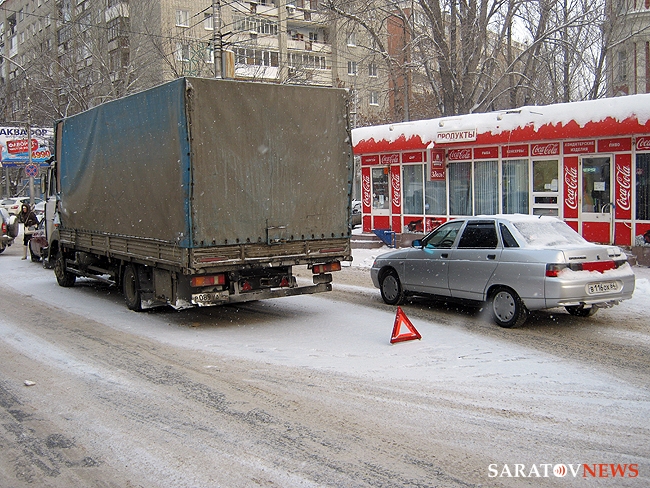 В эти минуты в Волжском районе Саратова наблюдается заметная пробка, возникшая из-за дорожно-транспортного происшествия. На улице Чернышевского двигавшийся от Московской в сторону моста через Глебучев овраг бортовой МАЗ врезался в попутную "десятку". По всей видимости, легковой автомобиль внезапно притормозил у пешеходного перехода, а водитель грузовика не успел среагировать.