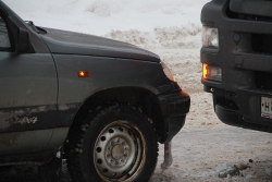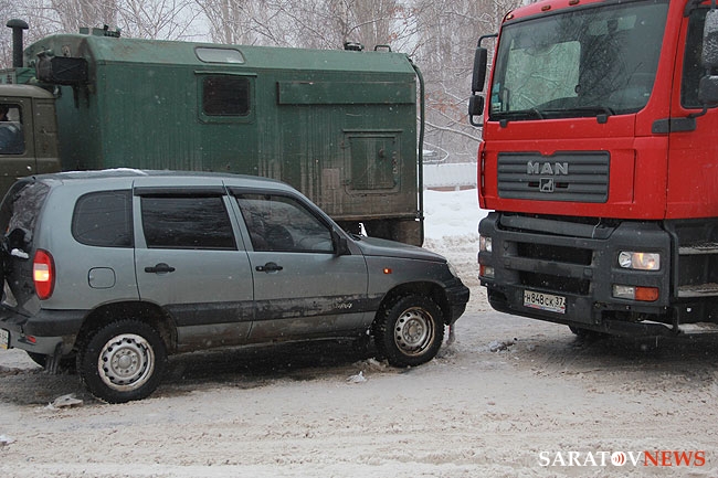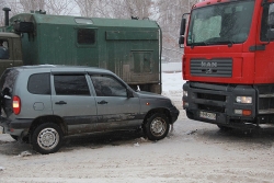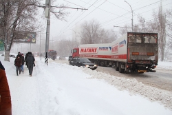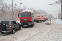 У остановки "Международная" на 50 лет Октября большегруз сети "Магнит" из-за незначительного столкновения с ехавшим навстречу "Нивой-Шевроле" развернуло так, что подъездной путь к площади Ленина оказался блокирован. В частности, из-за этого не ходят троллейбусы №5, 11. Без движения и мост через железную дорогу на 3-й Дачной.