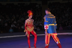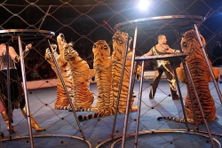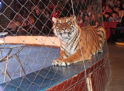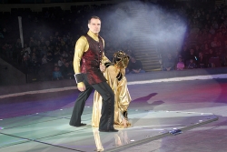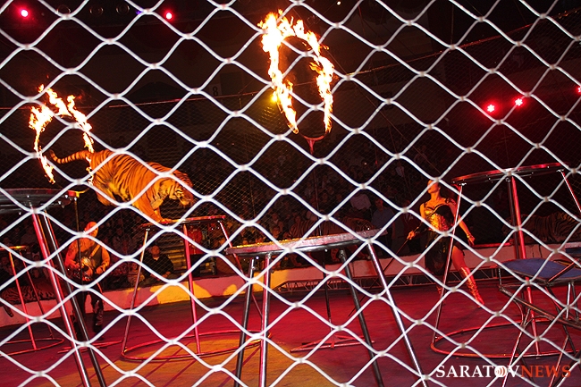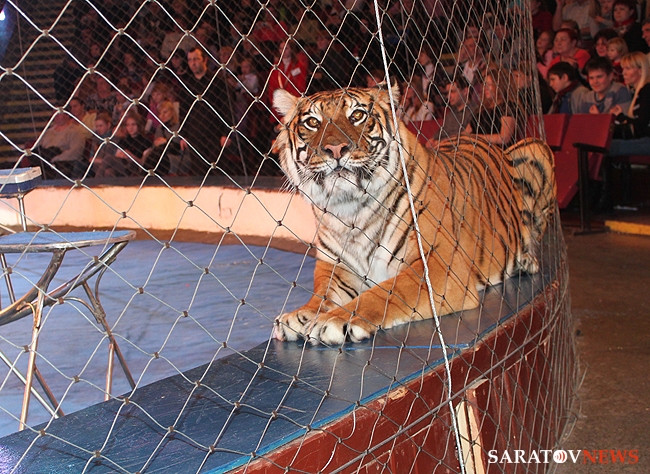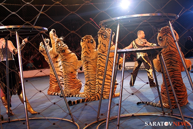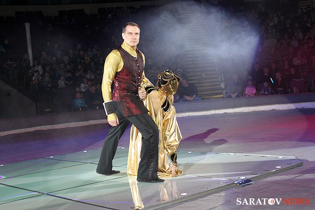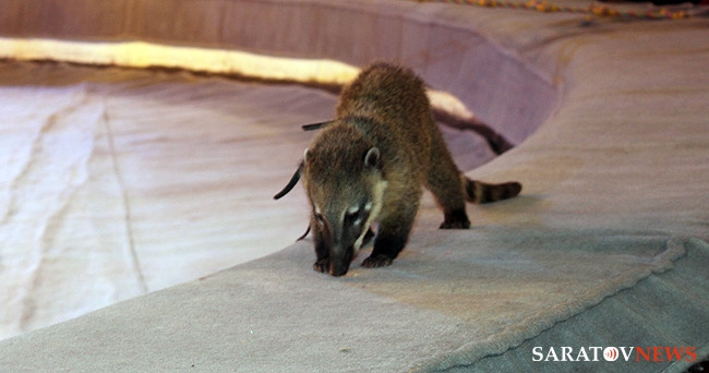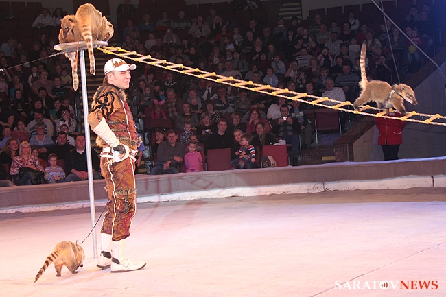 В числе артистов на сцену саратовского цирка имени Братьев Никитиных вышли Карина и Артур Багдасаровы, участники телепроекта "Цирк со звездами". В программе участвуют животные: еноты-носухи, обезьяны, аргентинские попугаи и уссурийские тигры.