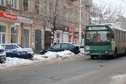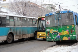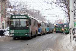 В связи со сложившейся обстановкой имеется задержка в движении троллейбусов №№ 4 и 5. Некоторые троллейбусы преодолевают путь на аккумуляторах, выезжая на встречную полосу, другие стоят складывая "рога".