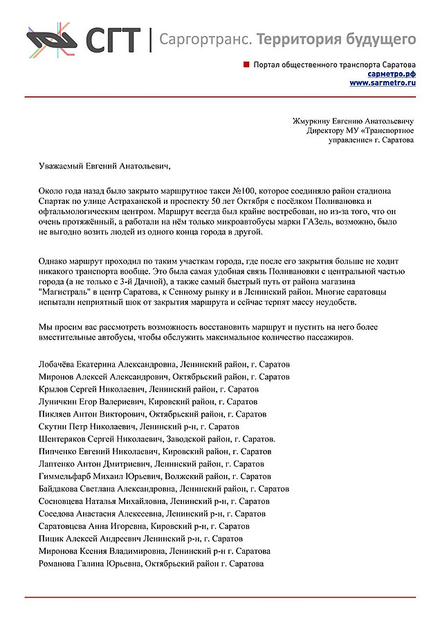 Жители Саратова направили обращение к МУ "Транспортное управление" города с просьбой организовать работу маршрутного такси №100 (улица Грибова – Офтальмологическая больница – поселок Поливановка). Как поясняется в сообщении на сайте sarmetro.ru, маршрут перестал работать 25 июля 2011 года.