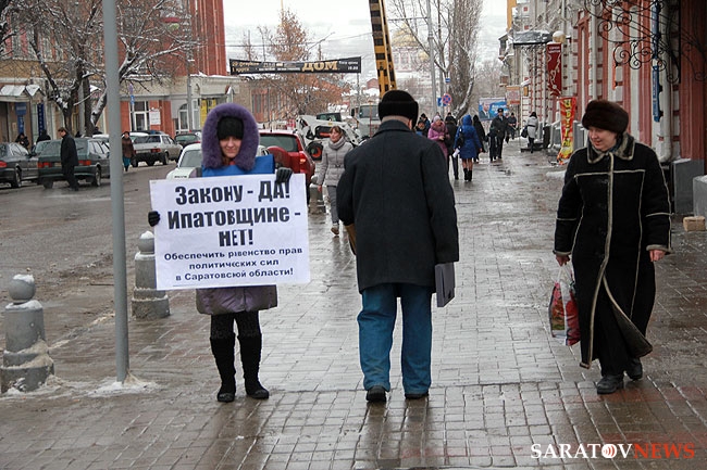 Всего участников пикета оказалось около 10 человек. Каждый встал вокруг здания облправительства на некотором расстоянии друг от друга с различными плакатами, характеризующими негодование политикой Павла Ипатова. В частности были призывы: "Ипатова в отставку!", "Закону - да! Ипатовщине - нет! Обеспечить равенство прав политических сил в Саратовской области", "Власть пора менять" и т.п.