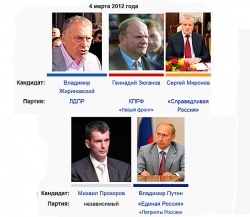 В президентской гонке участвует 5 кандидатов, из них четверо принадлежат к политическим партиям. Это Владимир Жириновский (ЛДПР), Геннадий Зюганов (КПРФ), Сергей Миронов ("Справедливая Россия"), Владимир Путин ("Единая Россия").