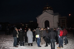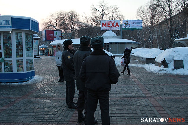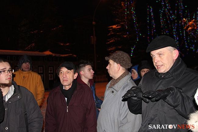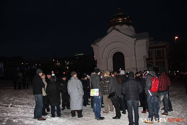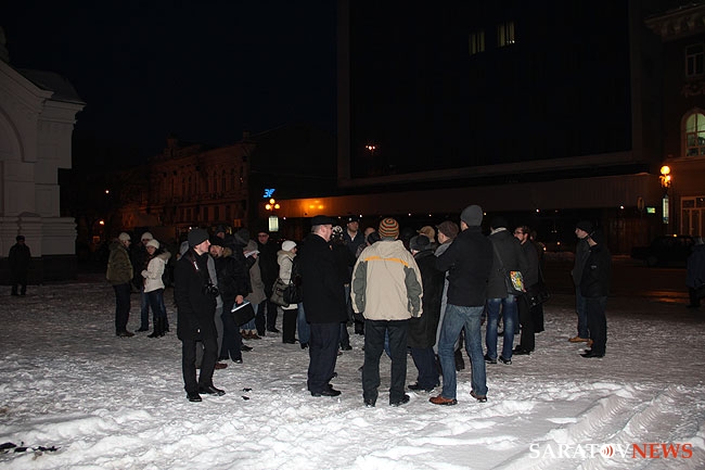 Никто так и не решился объединиться в группу, хотя было видно, что люди подходили на акцию. В соцсети "Вконтакте" были сообщения, что кто-то попробовал развернуть плакат, но, под угрозой задержания, его пришлось тут же свернуть. В результате было принято решение пойти на другой несанкционированный митинг, который организовал председатель Саратовского объединения избирателей Дмитрий Коннычев на Театральной площади у часовни. Там собралось всего порядка 20 человек, еще приблизительно столько же присоединилось. Полицейских там оказалось гораздо меньше.