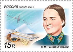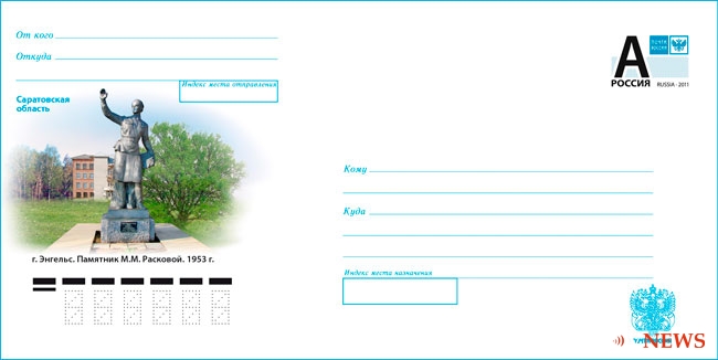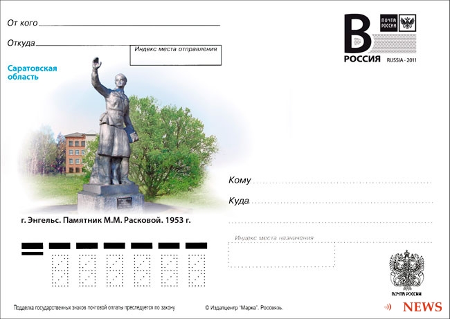 Кроме того, к этому знаменательному событию Саратовский филиал Почты России инициировал выпуск односторонней почтовой карточки, на которых запечатлен памятник Расковой, воздвигнутый в 1953 году в Энгельсе Саратовской области.