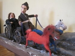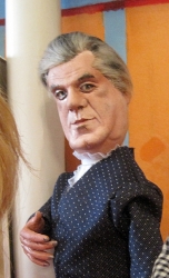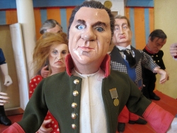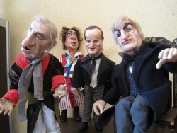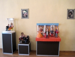 Свое место в экспозиции нашел и глава Саратова Олег Грищенко. Фигурка, очень напоминающая его, представлена в сцене из пьесы "Ревизор". Маленькая копия мэра в шинели городничего широко раскинула длинные, накачанные руки. В спину ему "смотрит" скульптура, очень напоминающая экс-губернатора Павла Ипатова, а слева к "главе Саратова" тянут руки миниатюрные копии лидера КПРФ Геннадия Зюганова и ЛДПР Владимира Жириновского.