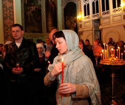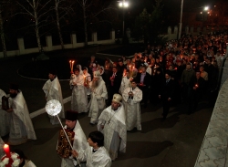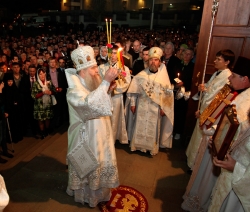 Под пение стихиры "Воскресение Твое, Христе Спасе" вокруг Духосошественского собора был совершен Крестный ход, который возглавил Митрополит Лонгин. По традиции, за Пасхальной заутреней Высокопреосвященнейший Владыка прочитал Слово огласительное святителя Иоанна Златоуста на Святую Пасху.