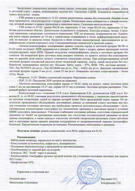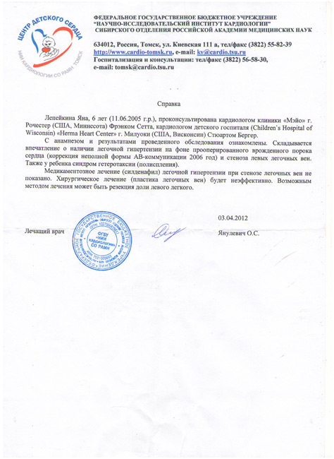 В июле 2011 года семья поехала в отпуск в родной город. В Томске Яне сделали УЗИ в кардиоцентре. Давление в легочных венах составило 63 мм р/с. "Врачи чуть в обморок не упали. Им было странно, как ребенок жил с таким давлением в легких", - сообщила мама девочки.