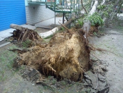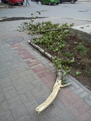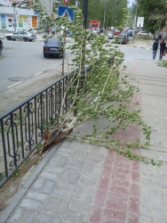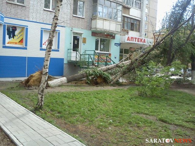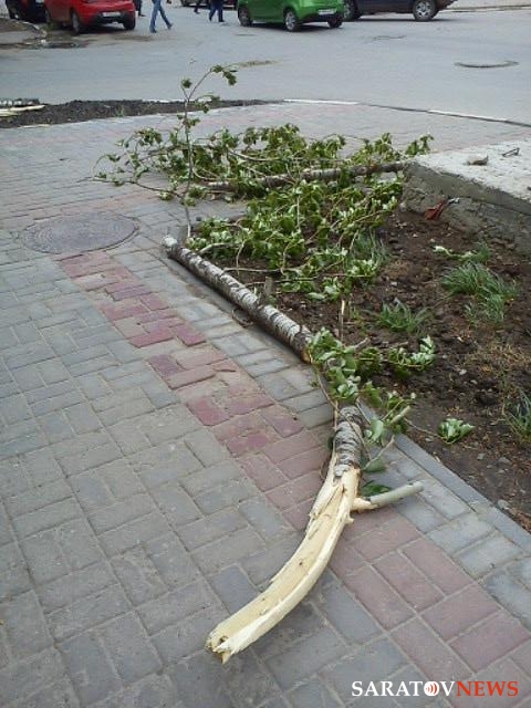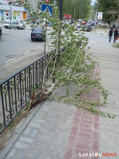 Как сообщил Saratovnews очевидец, ветви растения разбили козырек над входом в дом. Кроме того, ветер ломал ветви деревьев, а одно из них, также находящееся по улице Вольская, вывернул из земли с корнями.