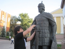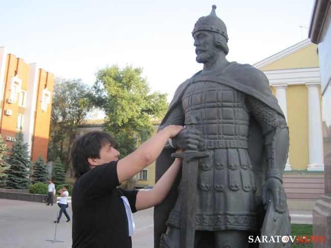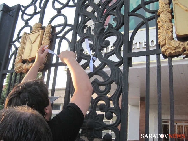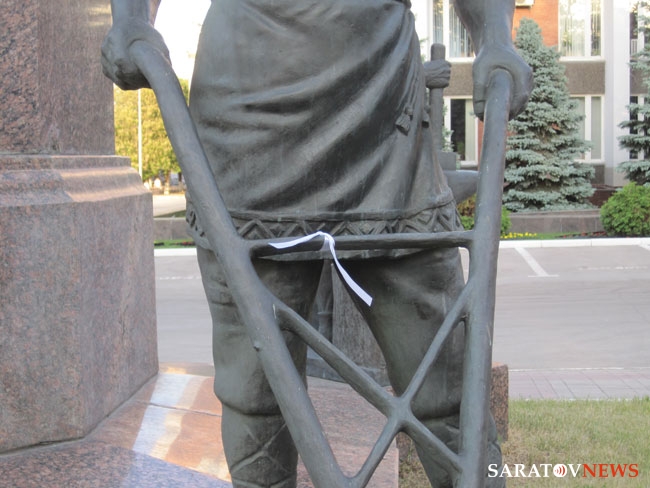 В итоге, после коротких разбирательств страж порядка оставил оппозиционеров в покое, однако наряд полиции из 2 человек (который сопровождал их еще от цирка) пошел следом за ними, когда "гуляющие" двинулись по улицу Радищева в сторону правительства Саратовской области. По дороге туда группа остановилась у памятнику Столыпину и один из собравшихся повязал белые ленты на бронзовых фигурах, что окружают памятники реформатору.