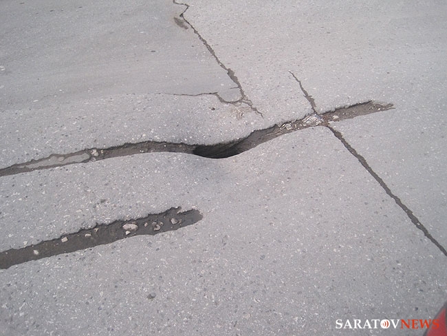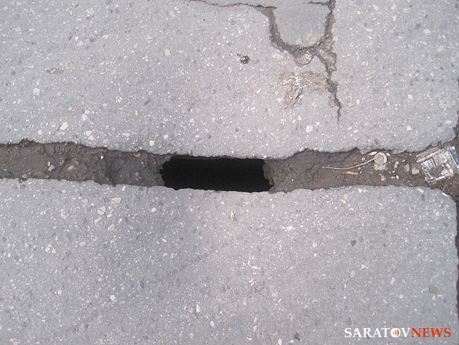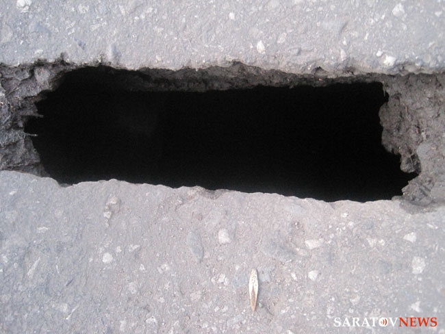 На пересечении улиц 2-я Садовая и Хользунова в районе Городского парка Саратова на проезжей части образовалась дыра в асфальте. Под ней находится яма глубиной и диаметром около полутора метров.