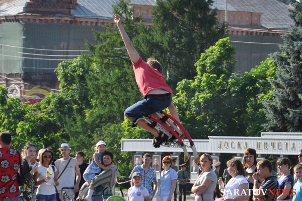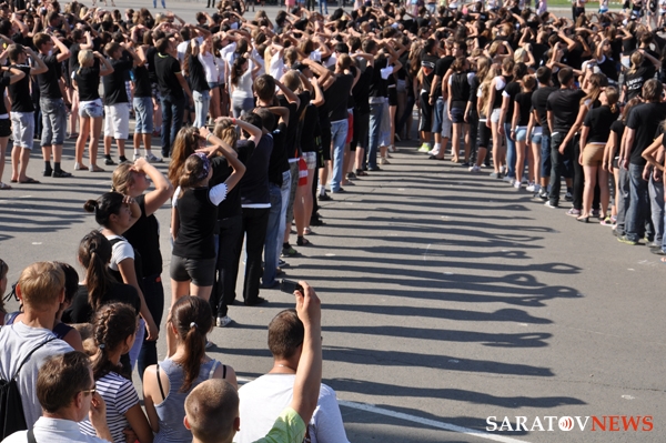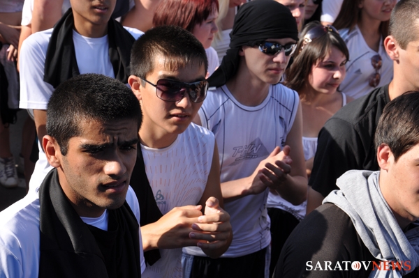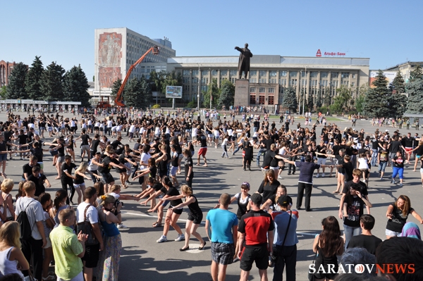 Вчера, в День России, на Театральной площади в Саратове состоялся танцевальный флешмоб «FM 64: Мы можем всё!», организованный городским центром молодежи при  участии студии танцев «Studio 64». 600 учащихся школ, средних специальных учебных заведений и студентов вузов исполнили коллективный танец, который, по задумке организаторов, олицетворял «борьбу позитивных и негативных идей в обществе».  Танцоры вышли на площадь в черных футболках и в процессе танца меняли их на белые, что, по задумке воплощало противостояние светлых и темных сил.