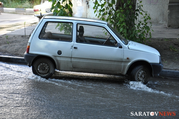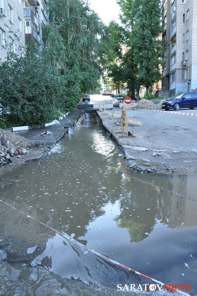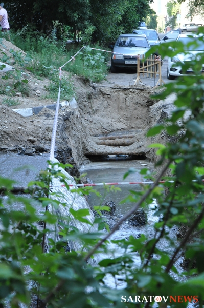 Вчера, 8 июля, при проведении работ на водоводе Саратова на углу улиц Чернышевского и Октябрьская произошла крупная авария. С утра рабочие выполняли вскрышные работы на проезжей части недалеко от остановки общественного транспорта. Внезапно, около 18.00 вырытый ими котлован наполнился водой, а затем холодная питьевая вода потекла вниз, на Набережную, по дороге заполнив еще один рабочий котлован на улице Лермонтова.