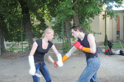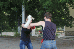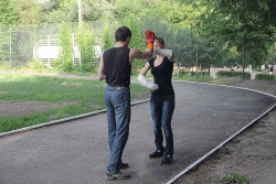 От тяжелых снарядов достаточно быстро устают руки. Особенно ощутимо это было в бою на шпагах и кинжалах. Тяжелое основное оружие быстро утомило правую руку, а нужно было еще сосредотачиваться на том, что делает противник и отражать удары. Новичкам советуют начинать с ножей - так проще освоить технику и не думать о ней во время тренировки на мечах, например. То, что удары ножа тоже нужно отбивать как можно быстрее и сноровистее, становится понятно после пары несильных попаданий тупым снарядом под ребра - это очень ощутимо. Но и излишняя спешка не нужна, надо стараться попасть не по лезвию, а по руке.