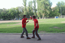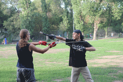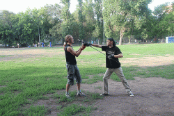 10 июля в Детском парке прошел мастер-класс по классическому и дуэльному фехтованию. Урок проводили опытные инструкторы, на мероприятие приглашались все желающие. Фехтовальщики расположились на краю футбольного поля, где и проводили занятия на рапирах и кинжалах, ножах, палках, двуручных мечах, винтовках со штыком и саблях.