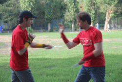 Затем корреспондент немного освоил фехтование на шпагах и шпагах с кинжалами. Своеобразный щит на рукоятке кинжала позволяет отражать удары противника. Как пояснил преподаватель, вместо кинжала можно взять плащ или пиджак. Необходимо приноровиться в регулярным взмахам одеждой - это тяжело. Неопытного противника при помощи этого предмета гардероба можно на некоторое время обезоружить - накинуть плащ на лезвие шпаги и одновременно уколоть. Более опытный соперник, скорее всего, справиться с этим приемом.
